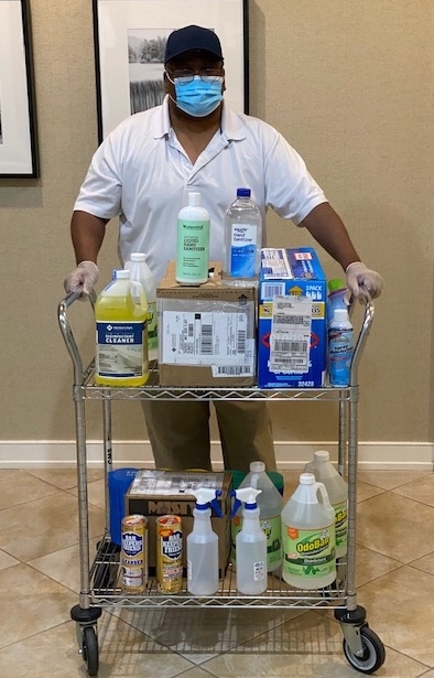 * Top photo, Ft. Bragg Operations Assistant, Michael Pringle demonstrating some of the cleaning supplies, sanitizers and PPE they are purchasing with donations such as ours. It’s all about keeping service members and their families safe at the Fisher House.