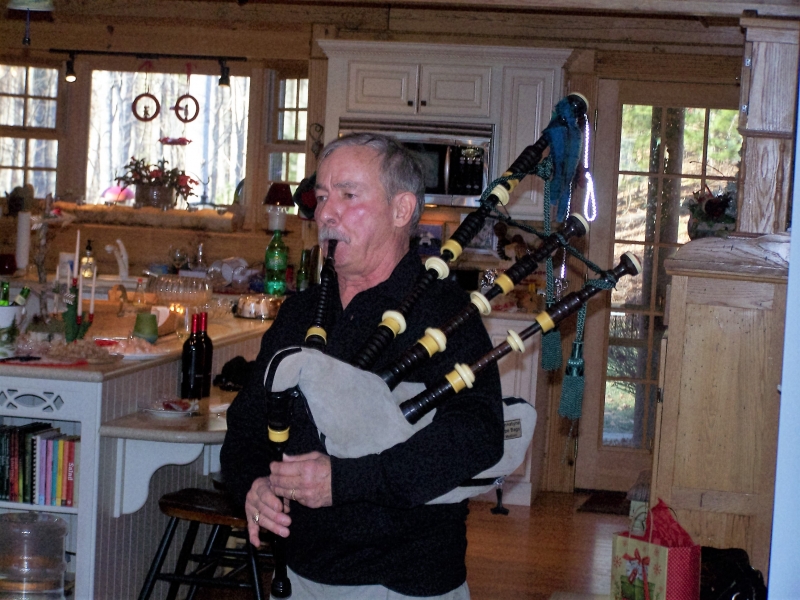 * New River Chapter members who attended the 2016 holiday party are shown (upper right) at the beautifully decorated home of Barbara Sears (lower right in front of the 14' + tree harvested from her property).